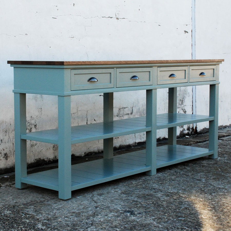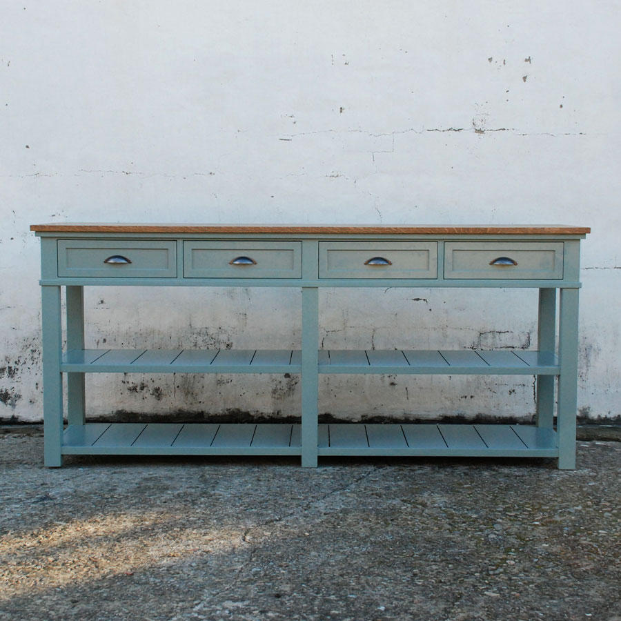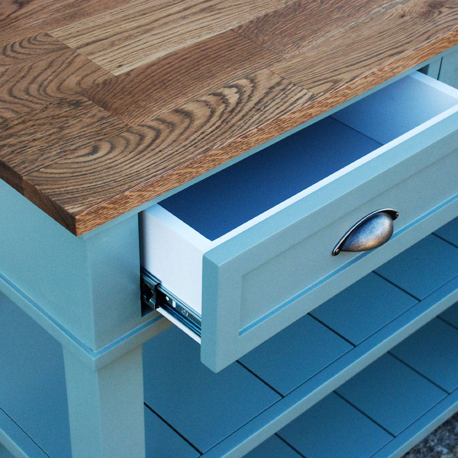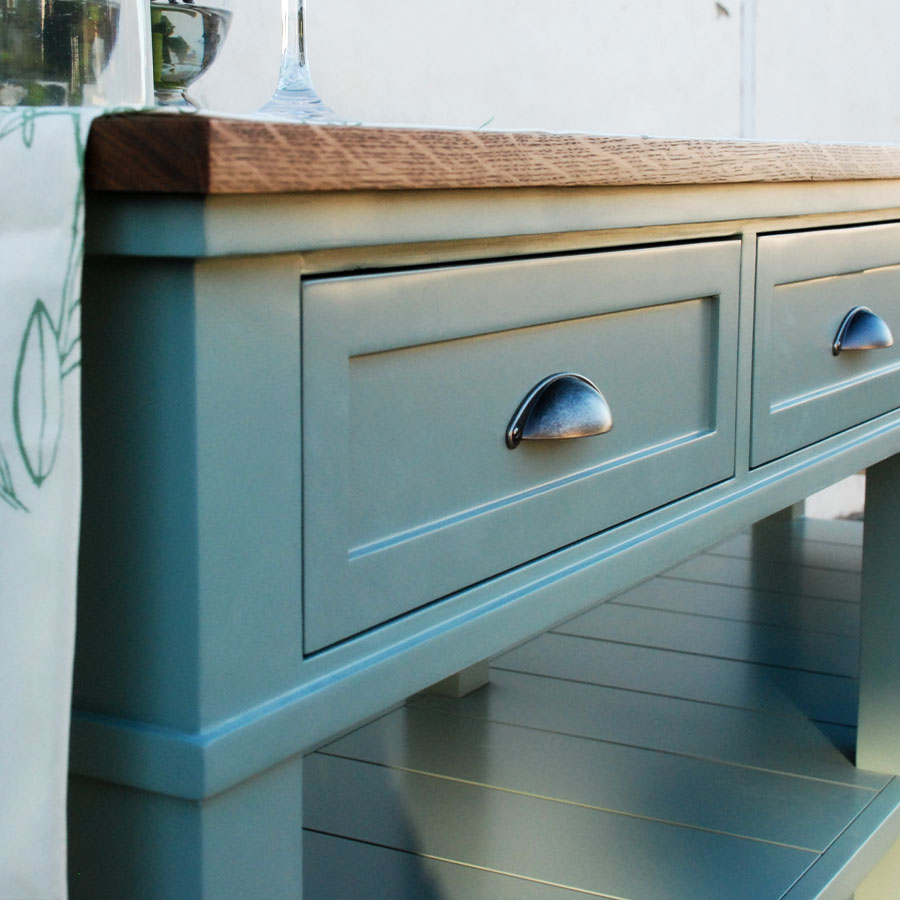 The Hunter Range is designed to bring a classic English countryside feel to your space. The range boasts beautiful dining or living room furniture crafted from clear Pine and MDF board. These interior furniture pieces are finished in “Sage” with a Solid Oak Butcherblock top in our “Gunsmoke” oiled finish. All our solid wood tops are sealed with a furniture wax to enhance the natural beauty of the timber.