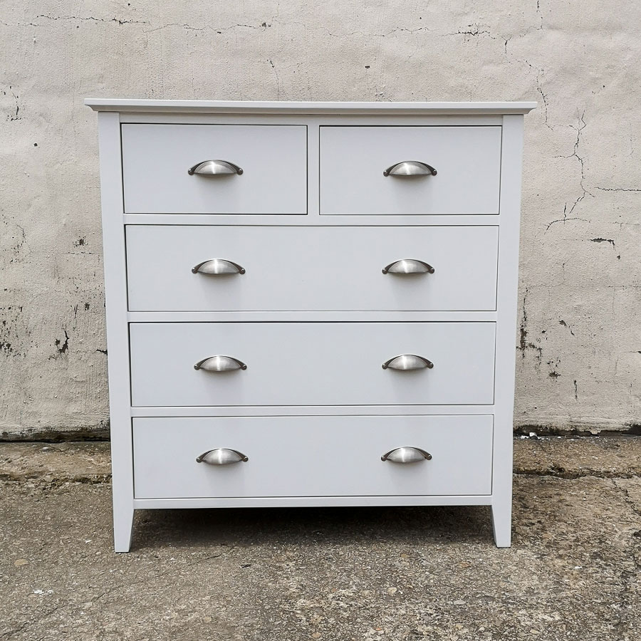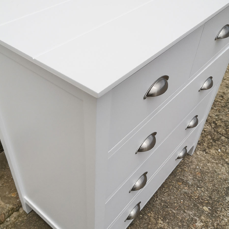 The New England Range includes beautiful coastal bedroom furniture with simple clean lines. The furniture pieces are crafted from clear Pine and MDF, finished in Solid White with a solid butcherblock styled Ash top. The solid wood tops are finished with a tinted oil and sealed with a protective furniture wax to enhance the natural beauty of the timber. All drawers are complete with drawer runners.